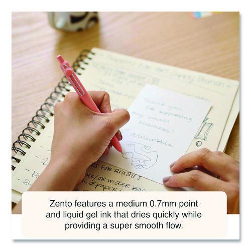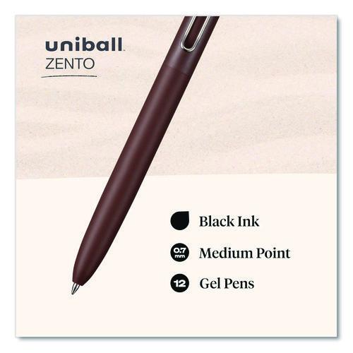 Product Details** Global Product Type Gel Pens Pen Style Retractable Pen Tip Type Conical Pen Point Size Type Medium Color Family Black Erasable Ink No Refillable No Pen Sub-Brand & Product Family Zento Pen Type Gel Pen Pen Point Size 0.7 mm Pen Ink Color(s) Black Pen Barrel Color(s) Assorted Pen Barrel Color(s) Assortment Adobe,Linen,Mist,Umber Permanent/Washable Ink Permanent Archival-Quality Ink Yes Airplane-Safe Ink Yes Low-Viscosity Ink No Special Ink Properties Quick-Dry Pen Grip Type Seamless Visible Ink Supply No Pocket Clip Indicator Yes Product Biodegradability Indicator N Product Biodegradability in Days 0 Product Compostability Indicator N Compliance Standards ACMI AP Non-Toxic Certified Pre-Consumer Recycled Content Percent 0% Post-Consumer Recycled Content Percent 70% Total Recycled Content Percent 70% Disclaimer Statement uni-ball® guarantees smooth, worry-free writing with every uni-ball® pen. If you’re not completely satisfied with our product, simply return it for replacement or a full refund. Find complete return instructions at uniballco.com/returns. Country Of Origin JP Carton Weight 4 lbs. Carton Pack Quantity 12 DZ Pack Quantity 0 UPC 030246706602 UNSPSC 44121705 Shipping Weight & Item Dimensions Weight 0.32 lbs. Length 5.86 in Height 3.25 in Width 1.1 in