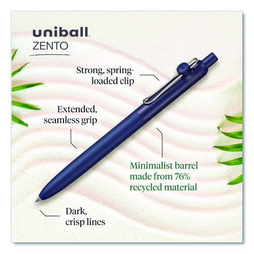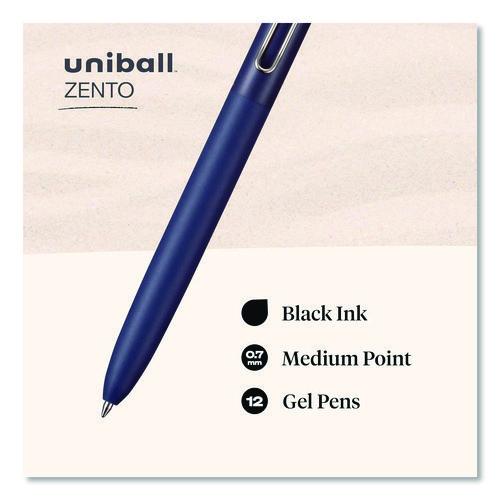 Product Details** Global Product Type Gel Pens Pen Style Retractable Pen Tip Type Conical Pen Point Size Type Medium Color Family Black Erasable Ink No Refillable No Pen Sub-Brand & Product Family Zento Pen Type Gel Pen Pen Point Size 0.7 mm Pen Ink Color(s) Black Pen Barrel Color(s) Assorted Pen Barrel Color(s) Assortment Coastal,Fog,Ivory,Lavender Permanent/Washable Ink Permanent Archival-Quality Ink Yes Airplane-Safe Ink Yes Low-Viscosity Ink No Special Ink Properties Quick-Dry Pen Grip Type Seamless Visible Ink Supply No Pocket Clip Indicator Yes Product Biodegradability Indicator N Product Biodegradability in Days 0 Product Compostability Indicator N Compliance Standards ACMI AP Non-Toxic Certified Pre-Consumer Recycled Content Percent 0% Post-Consumer Recycled Content Percent 70% Total Recycled Content Percent 70% Disclaimer Statement uni-ball® guarantees smooth, worry-free writing with every uni-ball® pen. If you’re not completely satisfied with our product, simply return it for replacement or a full refund. Find complete return instructions at uniballco.com/returns. Country Of Origin JP Carton Weight 4 lbs. Carton Pack Quantity 12 DZ Pack Quantity 0 UPC 030246706633 UNSPSC 44121705 Shipping Weight & Item Dimensions Weight 0.32 lbs. Length 5.86 in Height 3.25 in Width 1.1 in